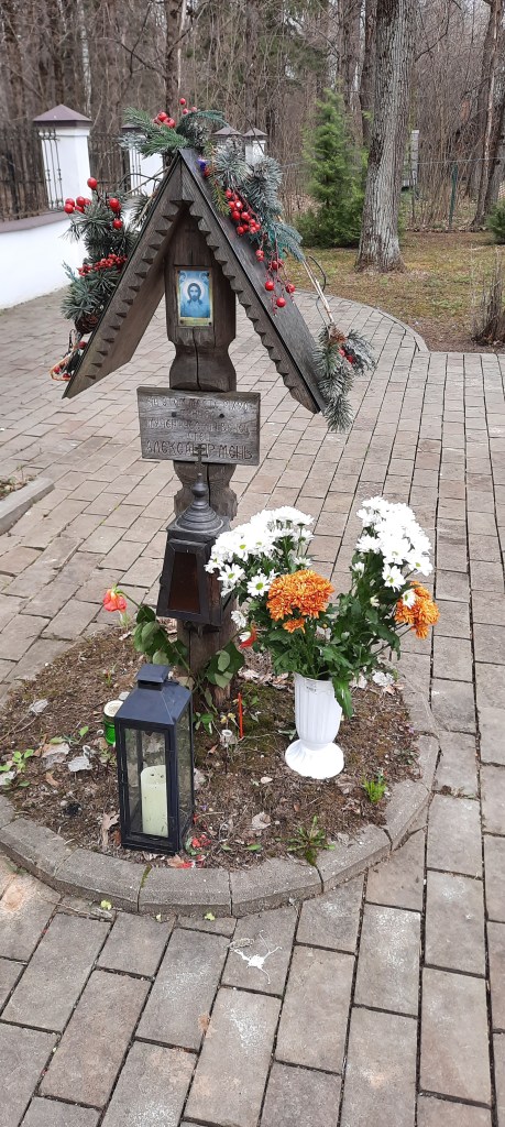 «На этом месте 9.IX.90 принял мученический венец отец Александр Мень» – надпись на божнице, установленной на месте убиения отца Александра Меня.